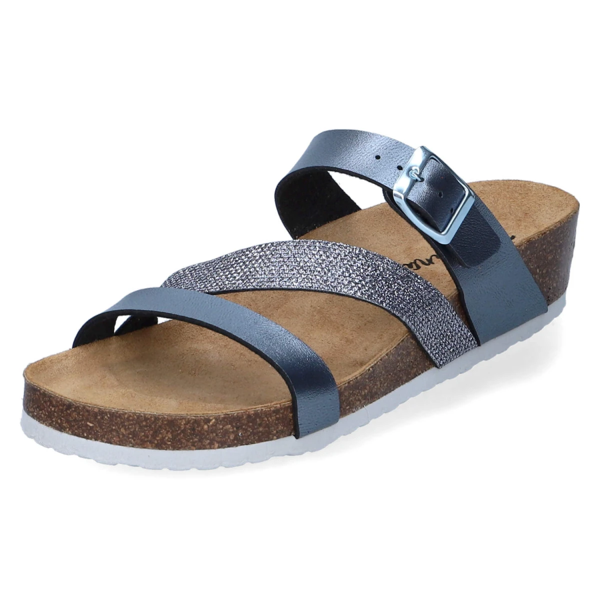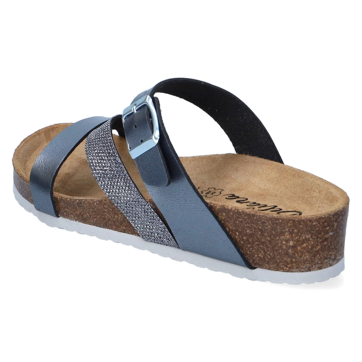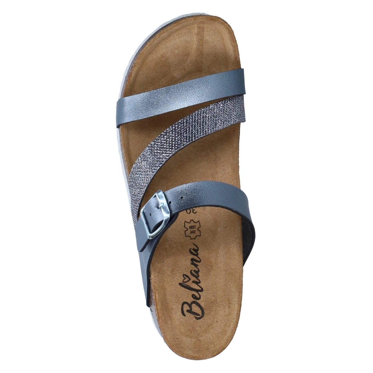 Beliana präsentiert eine graue Damen-Pantolette, die mit metallic schimmernder Oberfläche und sanften Glitzerakzenten edle Lässigkeit verkörpert. Drei filigrane Riemen mit Schnalle rahmen den Fuß elegant, die runde Spitze wirkt harmonisch und modern. Das Kunstleder mit designstarker Synthetik-Optik trifft auf ein relaxtes Leichtgewicht, das bei Stadtspaziergängen ebenso überzeugt wie beim Wochenendbrunch. Für Komfort sorgt das gepolsterte, vorgeformte Korkfußbett mit Lederdecksohle, während die flexible Profilsohle zuverlässigen Halt vermittelt. Die Passform fällt normal aus und macht Styling unkompliziert. Modetipp: Mit luftiger Culotte in Offwhite, Feinstrick in Taupe und einer metallischen Minibag entsteht ein minimalistischer, zugleich wirkungsvoller Look.