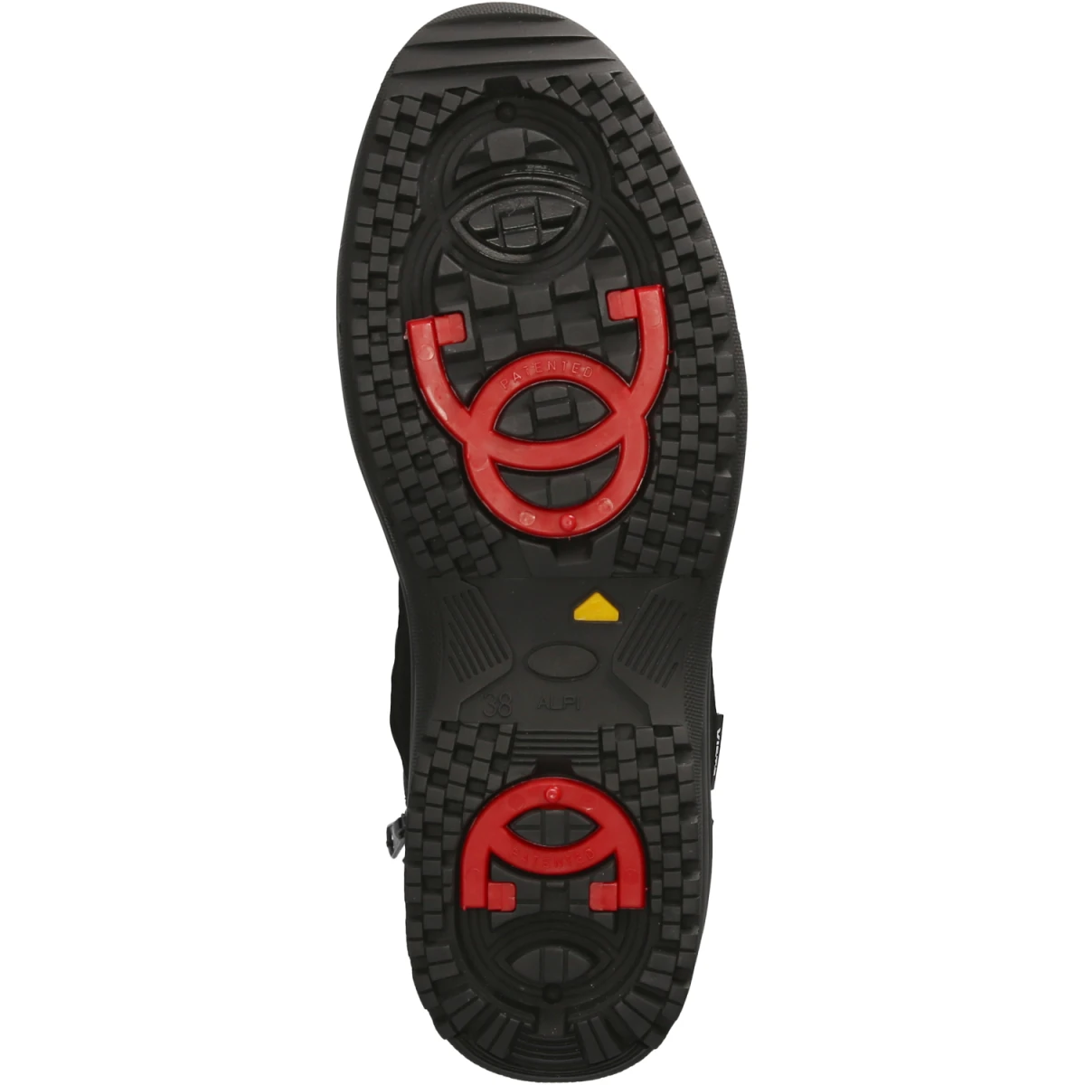 Für winterliche Touren konzipiert, überzeugt die Vista Damen-Stiefelette mit verlässlicher Performance. Textiles Obermaterial trifft auf wasserabweisende Ausrüstung und atmungsaktive Eigenschaften, wodurch der Fuß trocken und ausgeglichen bleibt. Warmfutter speichert angenehm die Wärme. Die Passform lässt sich über Schnürsenkel präzise einstellen, während der Reißverschlusseinstieg den Komfort erhöht. Eine runde Zehenpartie schafft Raum und der weich gepolsterte Einstieg reduziert Druckstellen. Über verschneite Wege führt die OC-System-Profilsohle mit rutschhemmendem Grip; bei Glatteis liefern ausklappbare Spikes zusätzliche Sicherheit. Die gepolsterte, wechselbare Decksohle unterstützt den Fuß und erlaubt individuelle Einlagen. Modetipp: In Kombination mit Cargo-Wollhose und Parka entsteht ein funktionaler Outdoor-Look mit urbaner Note.